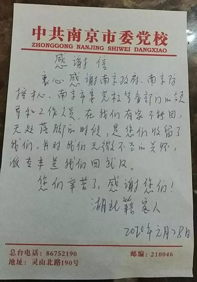 ? ?1月29日,11名在南京解除隔離的湖北游客被江蘇愛心車隊安全護送回到湖北。在此之前,他們與100多名游客一道從泰國飛回南京,得到南京人無微不至的照料。“該防的是病毒,不是武漢人”,“南京溫度”化解了湖北旅客的不安,也讓這座博愛之都贏得更多人點贊。