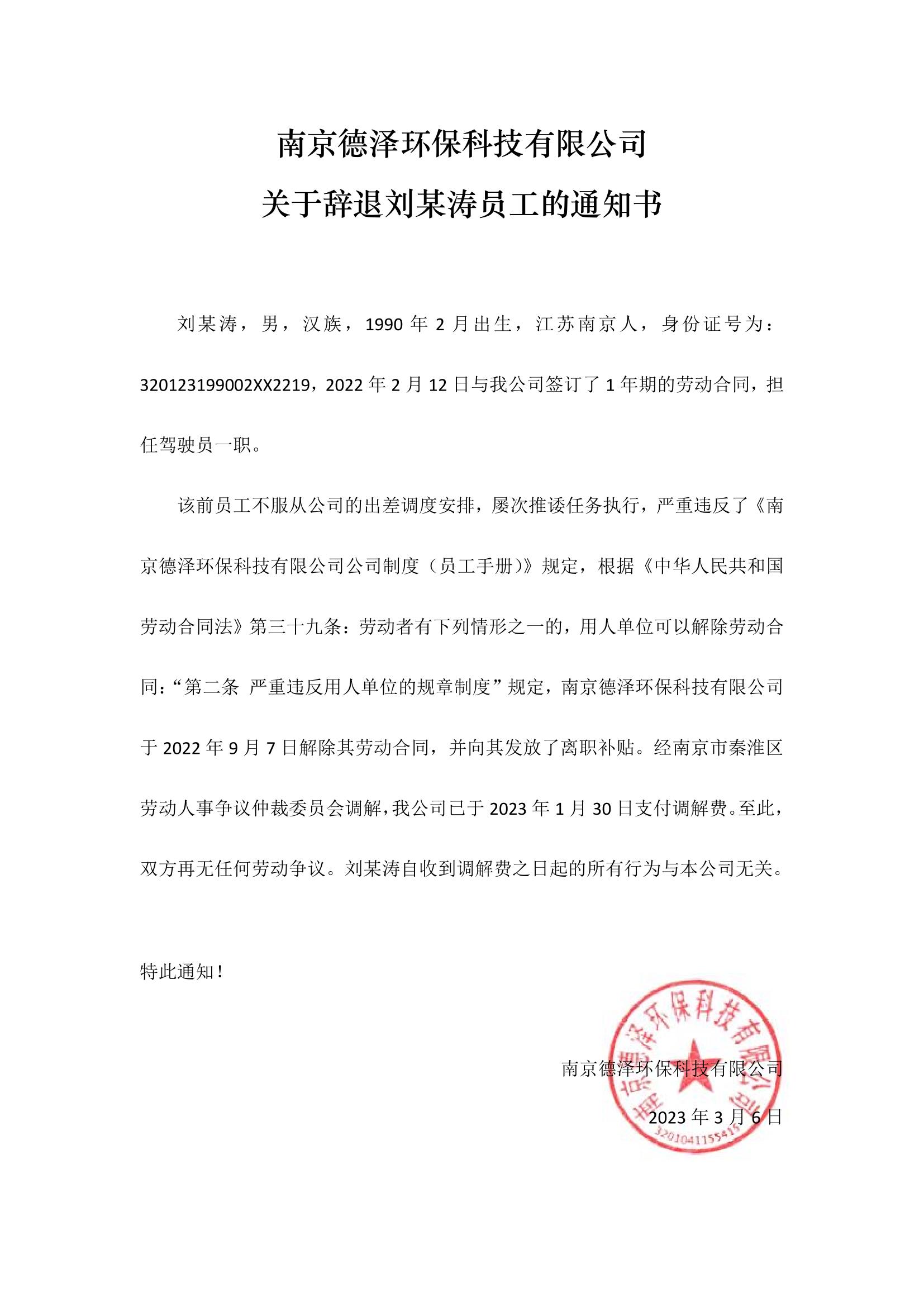 南京德澤環(huán)??萍加邢薰娟P(guān)于辭退劉某濤員工的通知書
