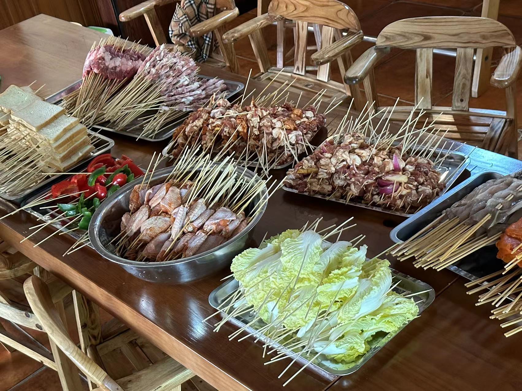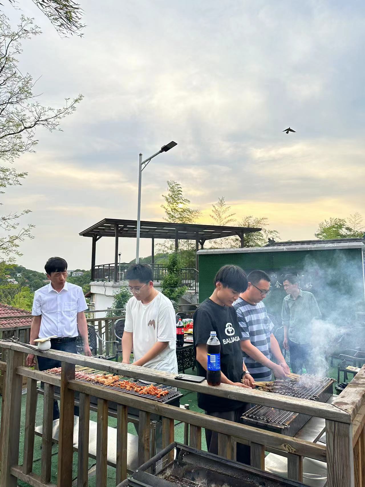 傍晚時(shí)分,夕陽作伴,大家紛紛展示了自己的廚藝,串上肥瘦相間的五花肉、點(diǎn)燃炭火,開始了DIY燒烤。肉串在紅藍(lán)相間的火苗炙烤下滋滋作響,漸漸地由紅變白,最后變成焦黃色,香噴噴的,讓人垂涎欲滴。