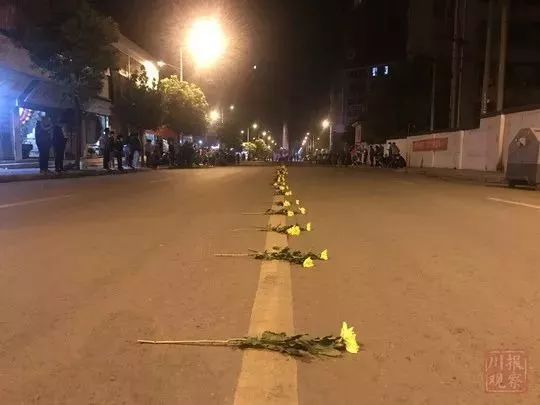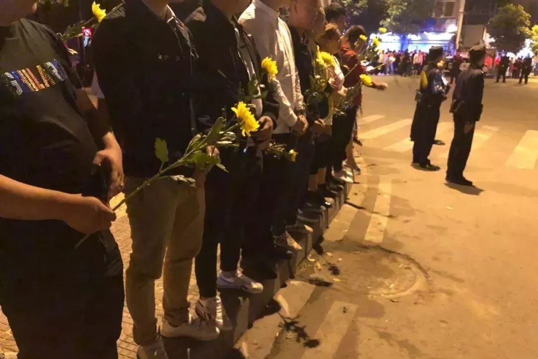 路面上擺放著菊花,寫(xiě)著挽言:救火英雄一路走好。